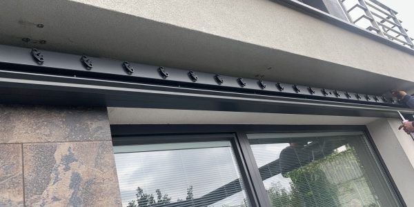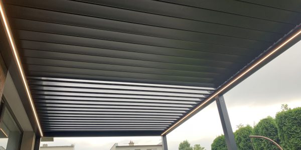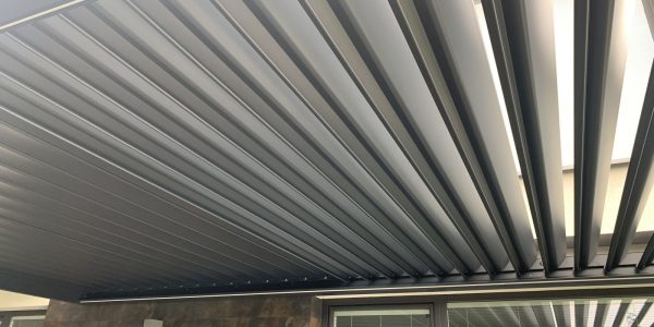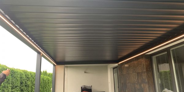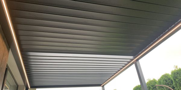 Pergola rozmeru 6 x 3,4 m v prevedení RAL7016-antracit štruktúra, s 2 sekciami naklápania a s LED podsvietením teplej farby.